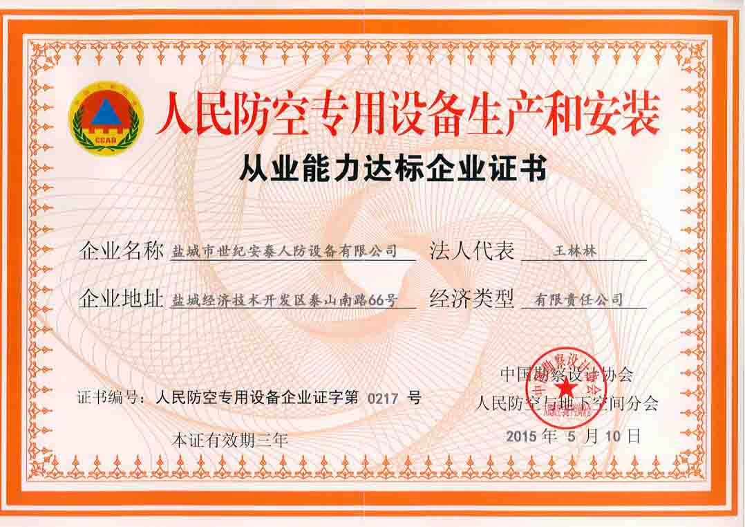 鹽城市世紀安泰人防設備有限公司是國家人民防空辦公室批準成立的人防工程防護設備定點生產(chǎn)和安裝企業(yè),是專業(yè)生產(chǎn)、銷售、安裝人防防護設備產(chǎn)品的企業(yè),公司主要生產(chǎn)鋼筋混凝土防護設備、鋼結(jié)構(gòu)手動防護設備、閥門、電控門、防電磁脈沖門、地鐵和隧道正線防護密閉門等各類產(chǎn)品并對產(chǎn)品進行安裝、調(diào)試、維修及保養(yǎng),公司生產(chǎn)的各種規(guī)格的人防工程產(chǎn)品,均按國家人防總參工程兵四所及中國建筑標準設計研究院提供的圖紙生產(chǎn),符合各種人防工程設計要求,是各類地下人防工程選用的理想產(chǎn)品。本公司已通過GB/T19001-2008IDT ISO9001:2008國家質(zhì)量體系認證。